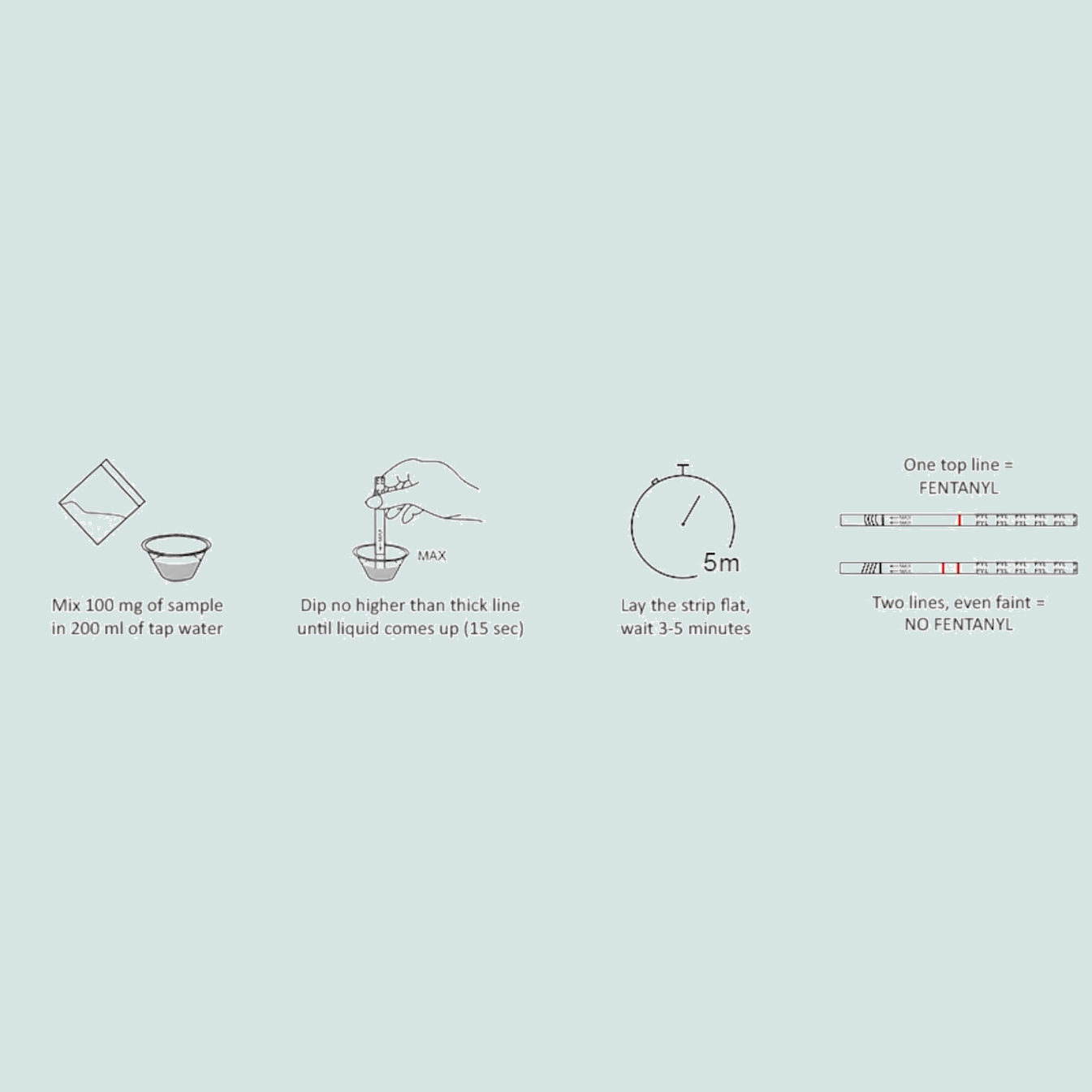 1 line = fentanyl, 2 lines = no fentanyl. Faint lines also count. Ignore fentanyl tester results after 5 minutes.
